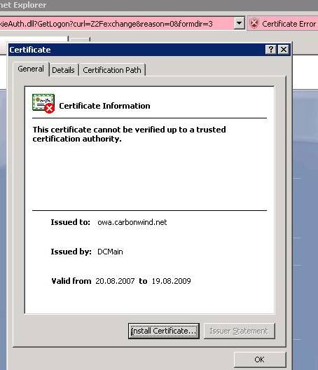 Since we went to https://owa.carbonwind.net/exchange the common name on the certificate must be owa.carbonwind.net otherwise IE will give us some warnings.