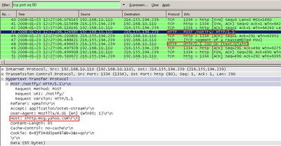 From this capture we can spot something interesting in the Host header field, the "shttp.msg.yahoo.com" pattern. Actualy if you scroll the capture you will see that this patern repeats. The "*.msg.yahoo.com" appears very often("shttp" can be replaced with "insider" for example). It seems that Yahoo Messenger "needs" this host string.