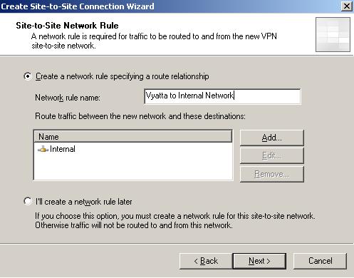 You now have the oportunity to define a network rule on ISA(this is required). It will be a route relationship between the Vyatta Remote Network and the Internal Network of ISA. This rule also specifies the local subnet of the site-to-site connection. In our case it will be 192.168.10.0/24. Note that you can define this rule later, but if you want to specify only some IP addresses from ISA's Internal Network you cannot do that because you do not have so much flexibility under ISA's implementation of IPsec tunnel mode site-to-site connection(you can do that with L2TP/IPsec site-to-site connections in ISA).