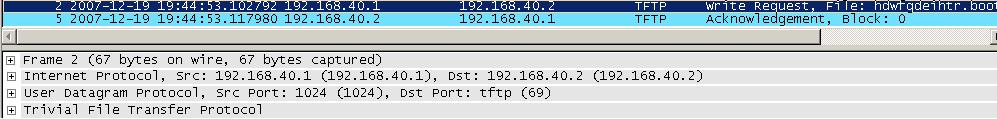 Since TFTP is say, "special", we need a special firewall rule for it. We can see from Figure25 and from Figure26, an attempting to save the configuration from Vyatta to the 192.168.40.2 TFTP server(TFTPD32 is used). First there is a Write Request from Vyatta to the destination UDP port 69 (TFTP port) and then there is a reply from the TFTP server to Vyatta, an Acknowledgement packet, with the source UDP port 44440 and not 69. So the firewall should be aware of that and dynamically allow TFTP traffic. I have specified a local ports pool on the TFTP server (44440:44450), thus Tftpd32 assigns the range of ports used for file transfers from that pool.