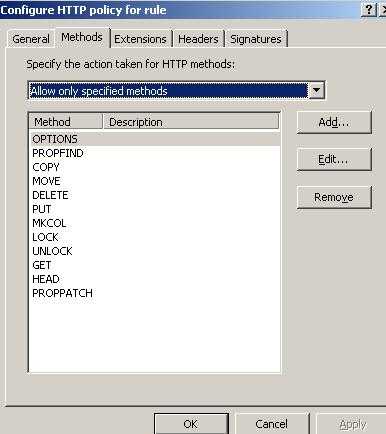 Here you have the choice of blocking some Methods or allow only some Methods. This is very useful for our webDav server.