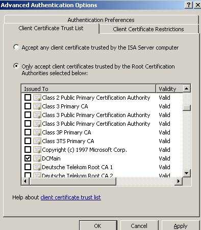 In the "Advanced Authentication Options" I have specified the CA from which ISA trusts user certificates. See Figure141.