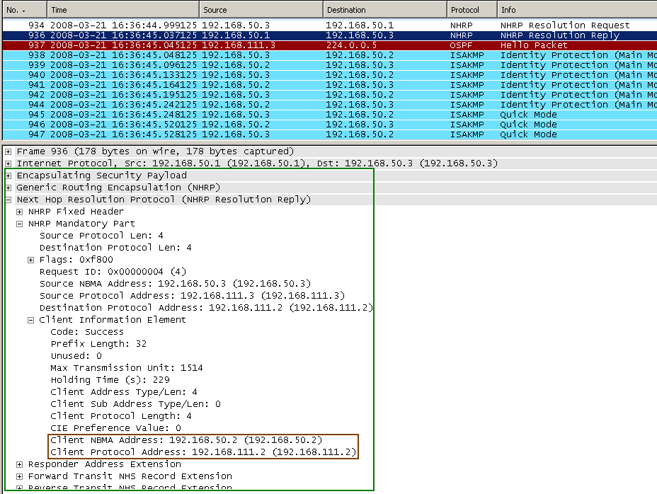 In Figure25 we can see Spoke1 initiating the VPN connection to the Hub (Spoke2 is turned off). After IKE MM and QM phases are completed, Spoke1 sends a NHRP Registration Request to the Hub. This enables the hub to dynamically learn the mapping information for the Spoke1, its physical address (192.168.50.2) associated with the the IP address ("ip address") of "interface Tunnel0 " from Spoke1 which is 192.168.111.2.