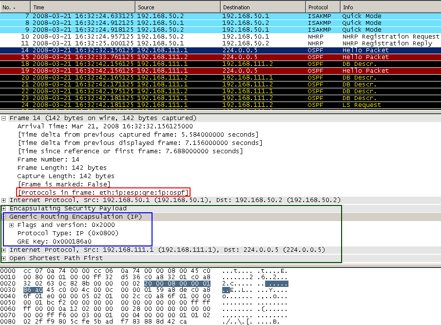 In Figure26 we can spot an OSPF multicast packet. After the NHRP Registration messages, the Hub and Spoke1 use OSPF to discover the network behind them. I've set the OSPF priority to 2 on the hub (to ensure that the hub becomes a DR ) and to 0 on the spokes (so a spoke will never become a DR) and the medium type is set to broadcast (on the tunnel interfaces: "ip ospf broadcast "). As can be seen, now the GRE header has 8 bytes, due to the presence of the GRE tunnel key. So, compared to the classical IPsec Tunnel Mode VPN site-to-site connection we have +8 bytes of packet overhead. Note that IPsec ESP Transport Mode is used.