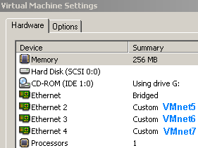 In Figure38 we can see the NICs on the host machine (Windows XP SP2 host OS). It can be noticed that all the VMware virtual adapters are disabled. I've manually disabled them because I do not want to slow down the host machine's startup phase with unnecessary enabled VMware virtual adapters. I will enable them if I need to. Note that I've manually set the IP address on these virtual adapters before disabling them. So each VMnet adapter will use the x.x.x.250/24 IP address(say 192.168.10.250/24, 192.168.30.250/24, 192.168.40.250, .....).