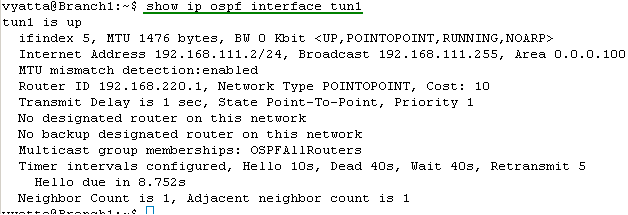 Figure102: Vyatta Branch1 GRE/IPsec: show ip ospf interface tun1