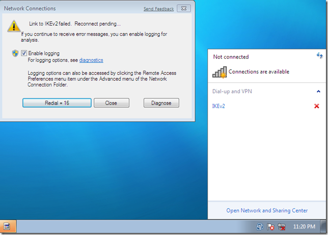 However, if within the specified Network outage time or so I don’t enable back one of the NICs of the Windows 7 VM, I get a message saying that the Link to IKEv2 failed. The default timer is set to 30 minutes.