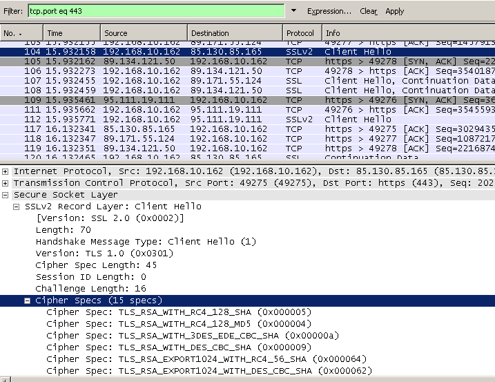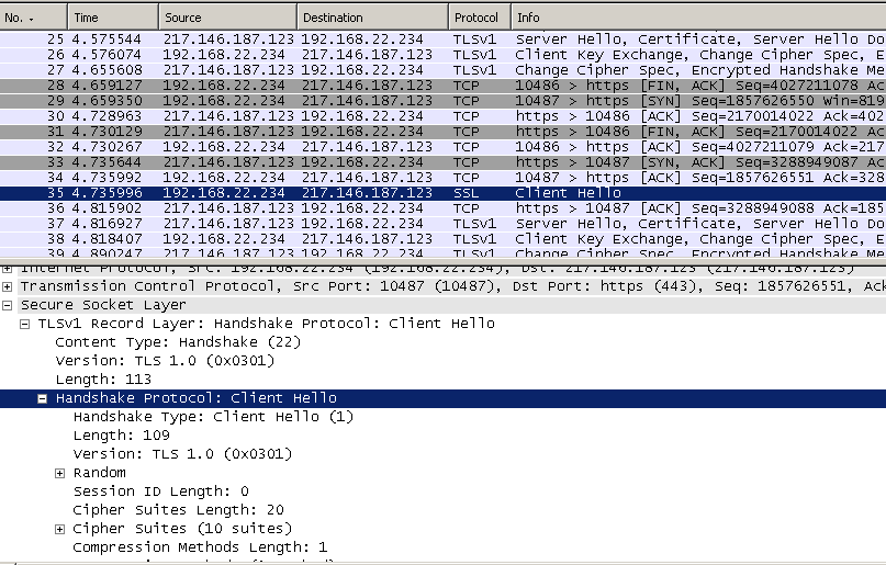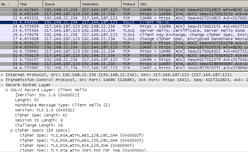 By looking at the Client Hello messages, I don’t use SSL 2.0 on the client and I have only 10 cipher suites enabled on it, so first is the Client Hello message used by the HTTPS Inspection on Forefront TMG, then is my client’s Hello message, note the protocol from TMG’s logs:
