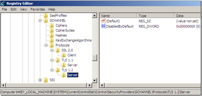 As can be noted from above, I’ve added some registry entries under [HKEY_LOCAL_MACHINE\SYSTEM\CurrentControlSet\Control\SecurityProviders\SCHANNEL\Protocols], which are: