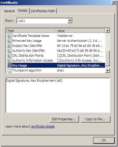 However, if I get a certificate from the very same CA, certificate containing a public RSA key(like bellow), as can be seen from above this certificate looks valid to Forefront TMG Beta 3 SE, and I can use it on the test web publishing rule.