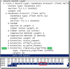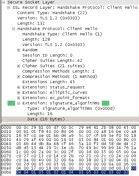 IE8 on Windows 7 Client Hello message original signature_algorithms extension vs modified signature_algorithms extension: