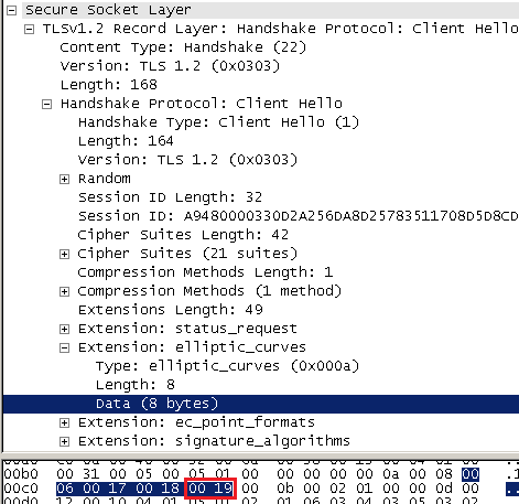 IE8 on Windows 7 Client Hello message original supported elliptic curves extension vs modified supported elliptic curves extension(look after secp521r1 (aka NIST P-521; value 25 = ‘0x0019’ in the supported elliptic curves extension extension) -TLS 1.2 Client Hello bellow, the supported elliptic curves extension is also used with TLS 1.0 and TLS 1.1-: