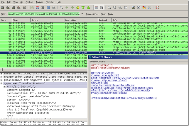 The Wireshark capture taken on the test.carbonwind.net web server shows that instead the GET request was routed to the 192.168.22.11 web server: