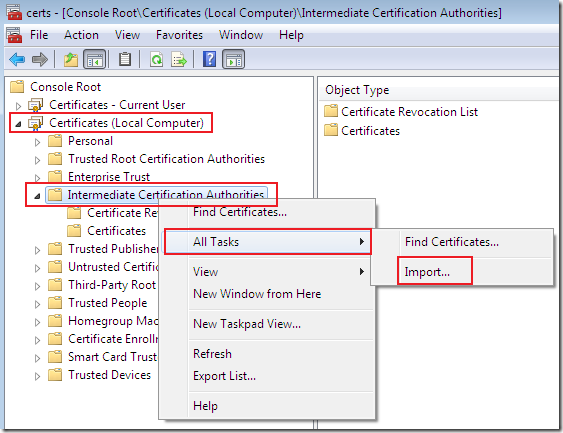 Then, after you’ve imported on the client the CA’s certificate within the Certificates Computer Store, Trusted Root Certificates Authorities, import the latest base CRL and the latest delta CRL into the Certificates Computer Store, Intermediate Certificates Authorities: