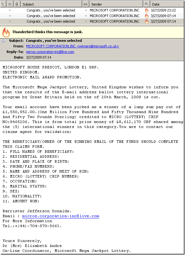 Three times lucky number in 16 hours… adrian Mar 28, 2009 share Facebook Twitter Google + LinkedIn Pinterest Email Share... Three times lucky number in 16 hours… Perhaps a little patience might "help" sometimes… I suppose you already know you should not reply to such messages…(in fact you should not even read/open such messages…).