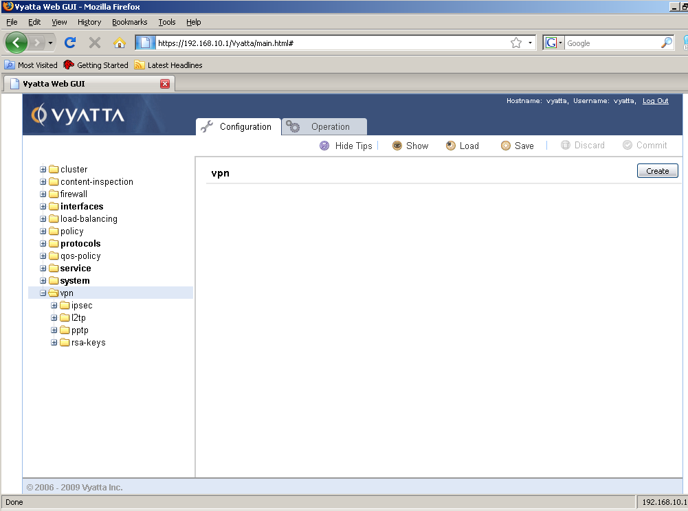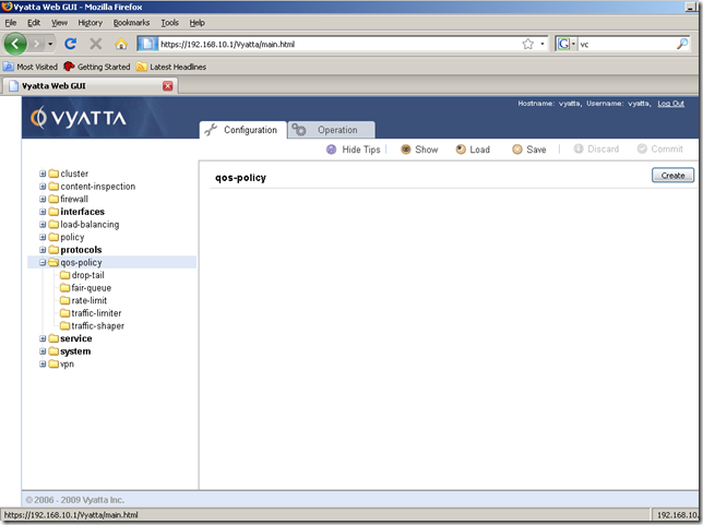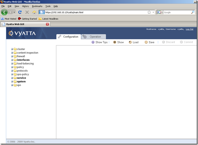 - the Configuration tab: the Navigation Area on the left and the Command Buttons Area on the top-right. From the Navigation Area we can configure the Vyatta OFR machine, configure the interfaces, the firewall, the routing protocols, the VPN, the web proxy etc. From the Command Buttons Area we can view the current configuration(the Show button), Discard or Commit the new configuration lines we’ve added(bellow the two buttons are grayed as there isn’t anything to be committed or discarded), Save the current configuration or Load another saved configuration. Also there are some available tips, we can display them using the Show Tips command button, or hide them using the Hide Tips command button in case we don’t need them anymore.